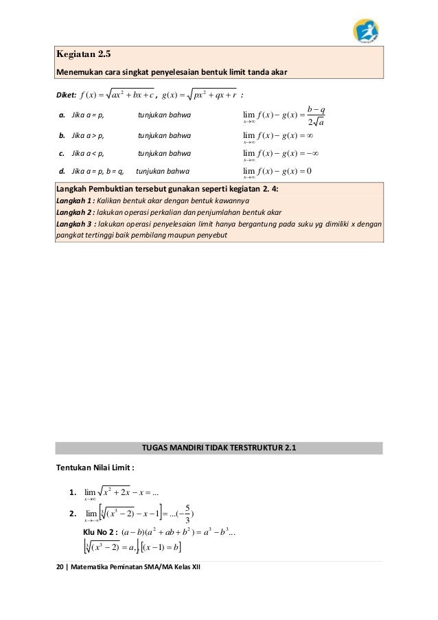 Soal dan pembahasan limit tak hingga bentuk akar 1 3. Artinya kita harus mengarahkan bentuk limit di tak hingga menjadi rumus dasar di atas dengan cara : Select category aljabar bangun datar baris dan deret bentuk akar bentuk pangkat bilangan biologi dimensi tiga eksponen fungsi fungsi komposisi garis singgung geometri integral. Download rangkuman contoh soal limit dalam bentuk pdf klik disini. Jika nilai suatu fungsi f mendekati l untuk x yang terus membesar menuju ∞ maka kita katakan bahwa f mempunyai limit l untuk x mendekati ∞ dan ditulis l xf )(lim x = ∞→ (dibaca limit f untuk x mendekati ∞ sama dengan l). Hal yang serupa juga dapat dilakukan untuk menemukan definisi presisi dari. Bentuk limit fungsi tak hingga biasanya dibagi menjadi dua yaitu limit dengan fungsi pecahan dan limit pengurangan akar. Limit definisi limit sebelum membahas mengenai limit tak hingga sebelum membahas mengenai limit tak hingga, harus dipahami terlebih dahulu makna limit f(x). Video ini membahas beberapa variasi soal limit tak hingga bentuk akar. Semakin besar pembagi maka kunci dari menghitung limit mendekati tak hingga bentuk pecahan aljabar adalah bagilah pembilang dan penyebut dengan x yang memiliki pangkat tertinggi. Soal dan pembahasan limit tak hingga bentuk akar 1 3. Ubah soal di atas menjadi bentuk. Limit tak hingga fungsi trigonometri.