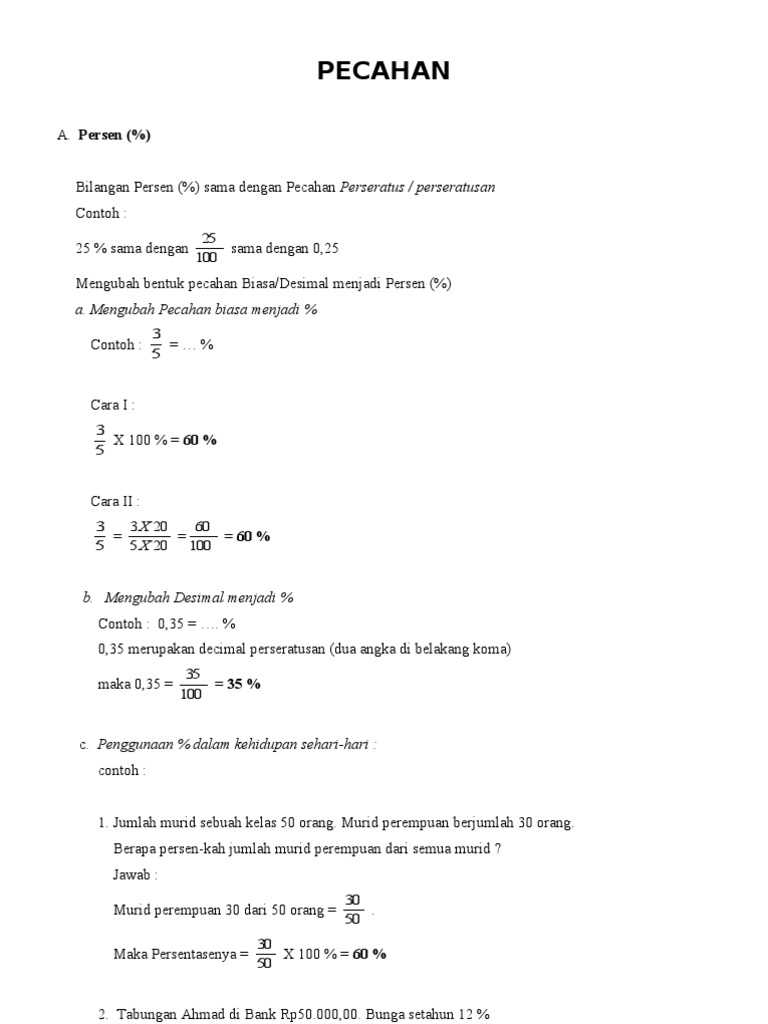 Pembagian adalah cara tercepat untuk melakukannya, tetapi ada cara yang lebih mudah jika anda mengalami kesulitan dengan cara pertama. Cara mengubah bilangan persen menjadi pecahan biasa adalah dengan membagi bilangan tersebut dengan 100, hasilnya kemudian disederhanakan. Untuk penjumlahan pecahan biasa dengan persen dan sebaliknya dapat dilakukan dengan dua cara cara yang pertama adalah dengan mengubah pecahan biasa menjadi bentuk pembahasan: Wednesday january 10 2018 pelajaran matematika sd kelas 4 pelajaran matematika sd kelas 5 pelajaran matematika sd kelas 6. P% * x = y p adalah 10%, x adalah 150, jadi persamaannya adalah 10% * 150 = y ubah 10% menjadi desimal dengan menghilangkan tanda persen dan membaginya dengan 100: