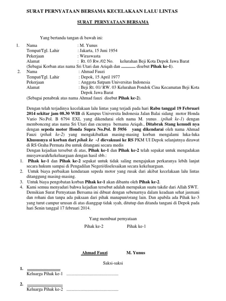 Contoh surat perjanjian damai kecelakaan lalu lintas jalan raya. Download contoh surat perjanjian damai kecelakaan lalu lintas, tidak akan menuntut, dalam format doc beserta cara membuatnya dengan baik dan benar. Contoh surat perjanjian damai kecelakaan lalu lintas contoh surat perdamaian kecelakaan lalu lintas singkat padat dan … Contoh surat perjanjian perdamaian bersama dalam bentuk format word doc. Sehubungan kecelakaan lalu lintas yang terjadi pada hari senin, tanggal :